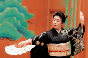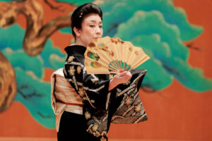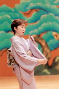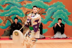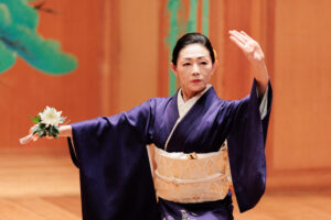 能「道成寺」を元に、歌舞伎の名作 長唄「京鹿子娘道成寺」が作られ、地唄、そしてこの荻江節へと変 化しました。道成寺作品全般に共通する、僧侶に恋をし、裏切られるという女性の気持ちが描かれてい ますが、荻江では、その激しい恋ごころや恨みを、抑制し、ゆったりとした細かな動きで表現します。