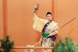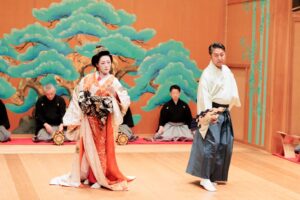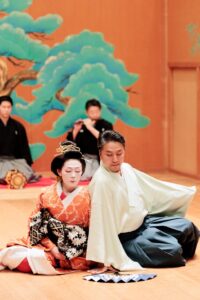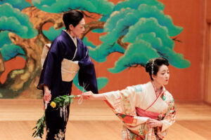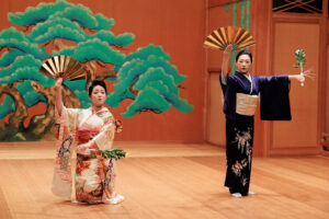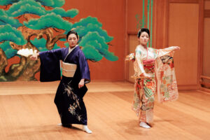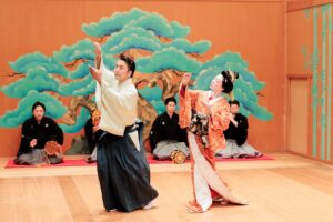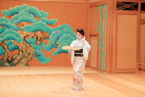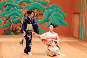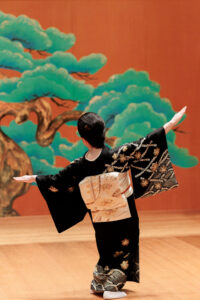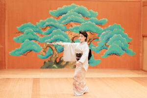 常緑樹である松は、長寿、家の繁栄等の縁起のよい象徴とされ、松(待つ)にかけた幾世も超えて築か れた幸せや、松の位の太夫の吉原の風情も折り込まれ、豊かな繁栄が永遠に続くようにとの願いが込め らています。松が、厳かで穏やかに時代の変遷を見守り、泰平を望むという御祝儀舞踊です。